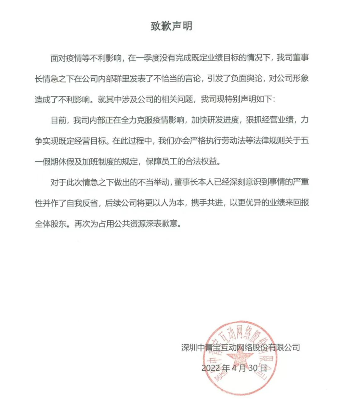 声明称,目前,中青宝内部正在全力克服疫情影响,加快研发进度,狠抓经营业绩,力争实现既定经营目标。在此过程中,中青宝亦会严格执行劳动法等法律规则关于五一假期休假及加班制度的规定,保障员工的合法权益。“对于此次情急之下做出的不当举动,董事长本人已经深刻意识到事情的严重性并作了自我反省。”