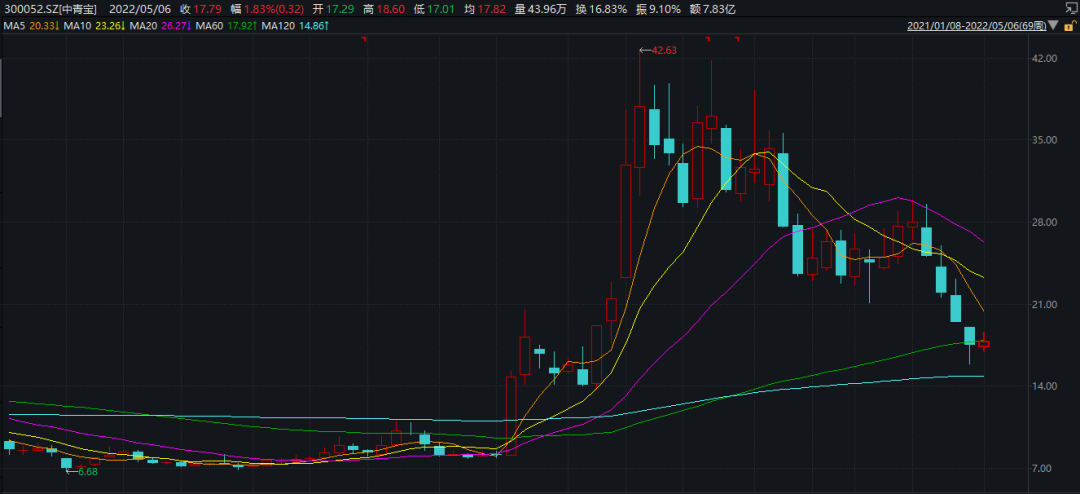 截至5月6日,中青宝收报17.79元/股,微涨0.23%,总市值46.61亿元,和2021年11月的高点相比,已缩水超50%。
