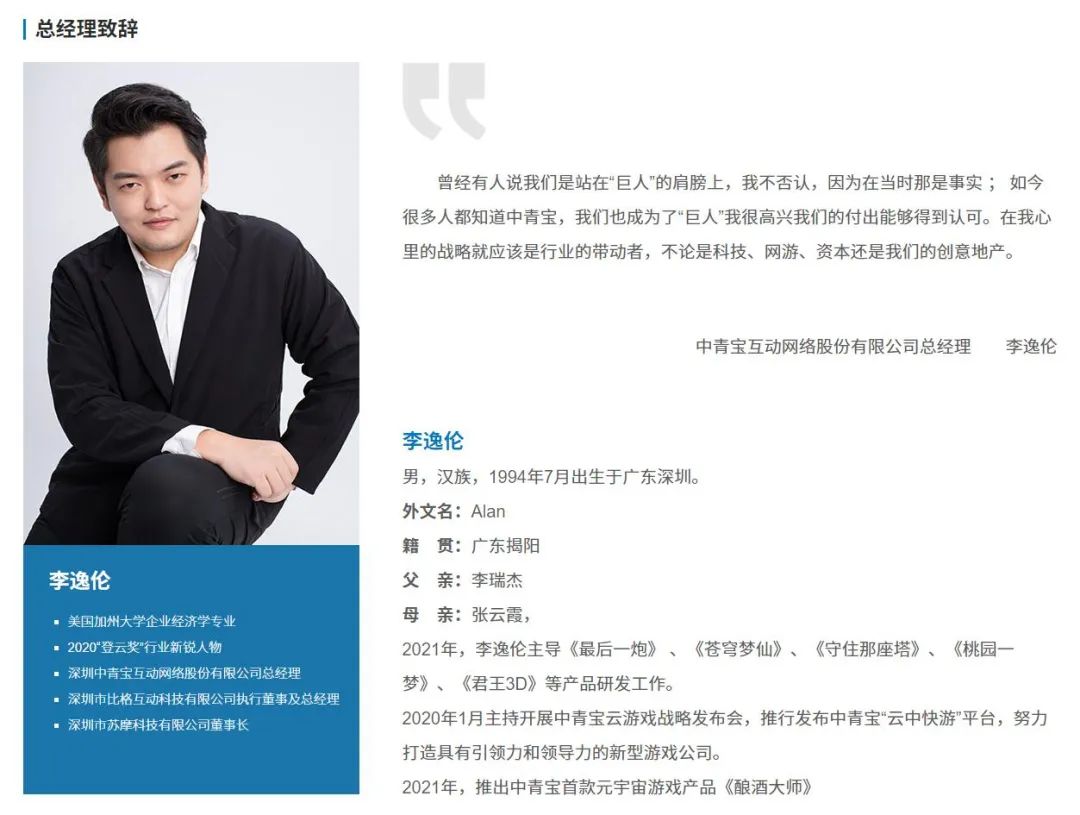 公告显示,李逸伦出生于1994年,2017年12月-2020年1月为中青宝首席运营官;2020年1月起,担任中青宝总经理职务。此前,李逸伦在中青宝旗下多家子公司担任董事长、执行董事、总经理职务。