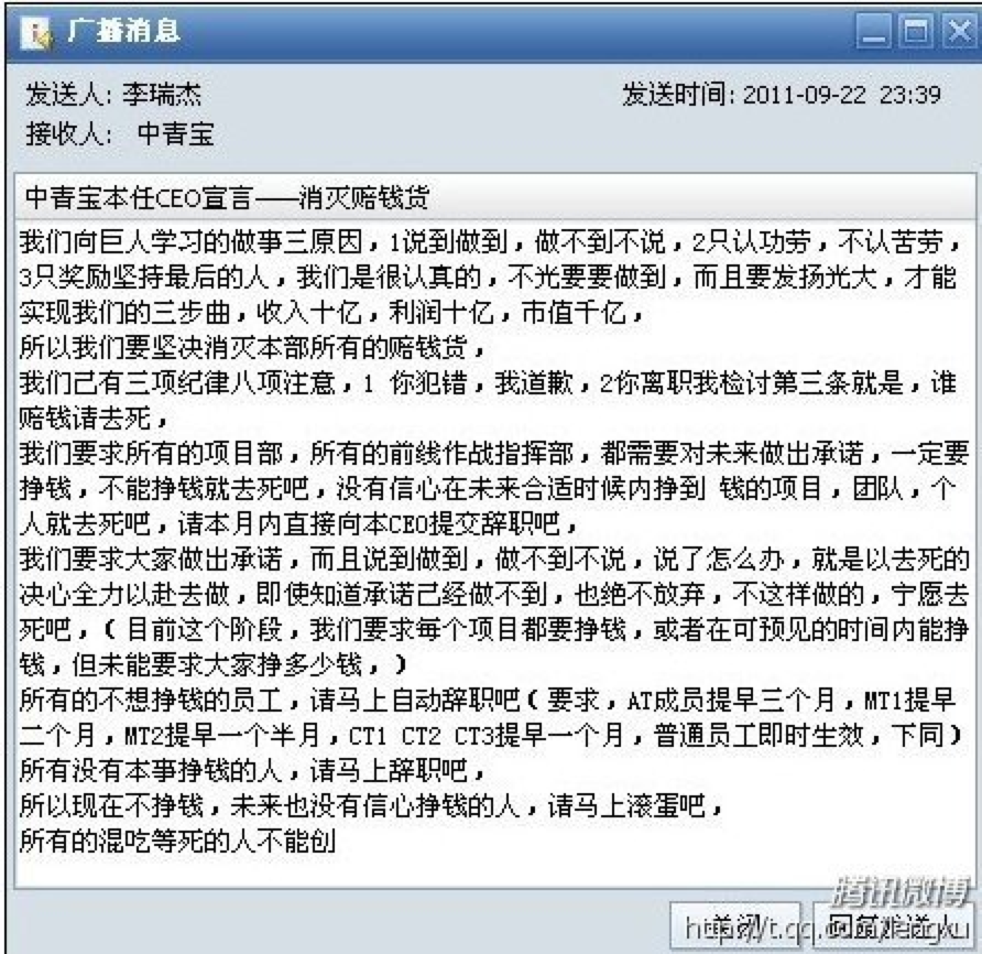 2011年9月底,据腾讯科技报道,中青宝CEO李瑞杰放出了“要消灭公司所有的‘赔钱货’的战斗宣言,还称“谁赔钱请去死”,让不挣钱的员工统统滚蛋。