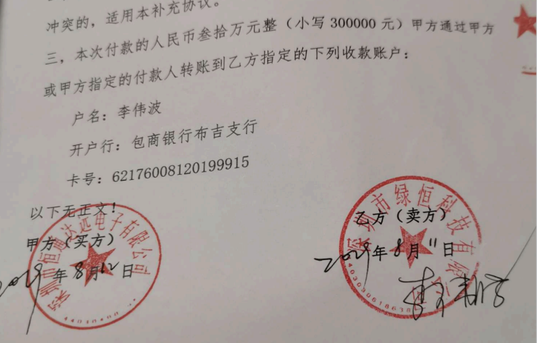 8月12日,双方再次签订了《补充协议一》,重申了3181.18万元的交易金额,但是对支付方式作出了改变,首笔转让价款降到了30万元,首笔款项支付完成后绿恒科技就需7天内配合恒通达远进行股权过户,过户完成后恒通达远再支付370万元。