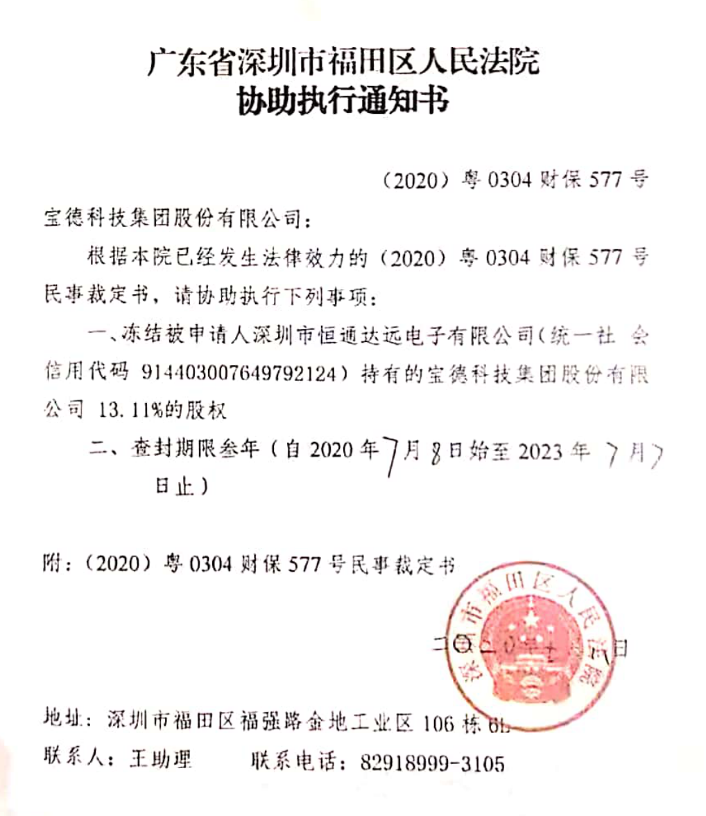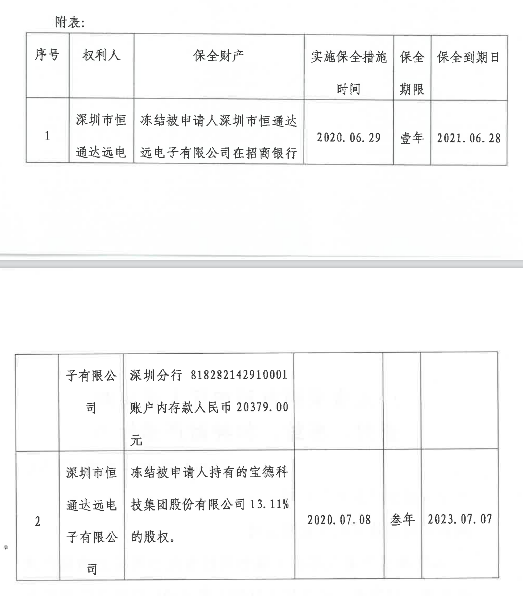 与此同时,广东省深圳市福田区人民法院根据绿恒科技的申请保全了恒通达远名下财产,包括冻结存款2.04万元及其持有的宝德科技13.11%的股权,期限分别为一年、三年。