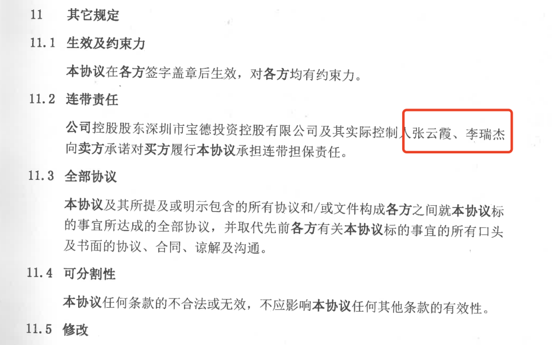 绿恒科技提供的《股份转让协议》的第11.2条连带责任中显示,李瑞杰与张云霞承担连带担保责任,包括上述《补充协议一》中李伟波与宝德投资的债务抵扣等细节也表明恒通达远与宝德系关系匪浅。