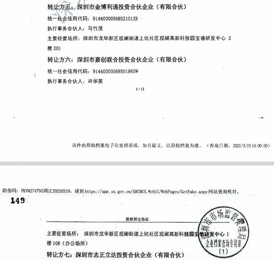 至于嘉创联合的执行事务合伙人许华英,则曾为马竹茂担任法人的深圳市和诚博创科技有限公司的股东。并且,股权转让协议书显示,嘉创联合与金博利通的主要经营场所均在深圳市龙华新区观澜街道上坑社区观澜高新科技园宝德研发中心。