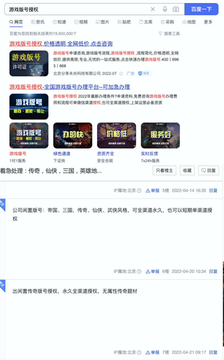 不过,自2018年以来,游戏版号收紧甚至一度停发,让“购买版号”、“版号授权”等违规交易暗流涌动。记者在搜索引擎输入“游戏版号授权”作为关键词,便发现多个有关游戏授权、转让的中介机构广告。在百度贴吧内,也有不少出售游戏版号的帖子。