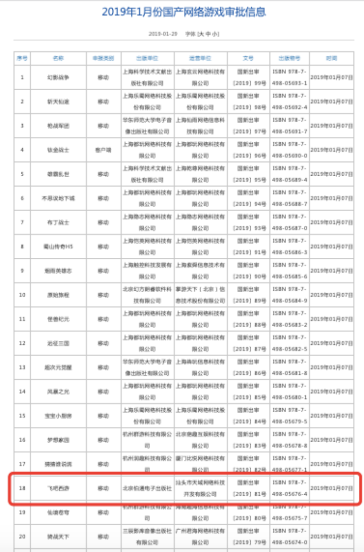 记者从国家新闻出版署官网查询发现,2019年1月份发放的国产网络游戏审批信息就包含了《飞吧西游》,其出版单位是北京伯通电子出版社,运营单位是汕头市天域网络科技开发有限公司(下称“汕头天域”)。