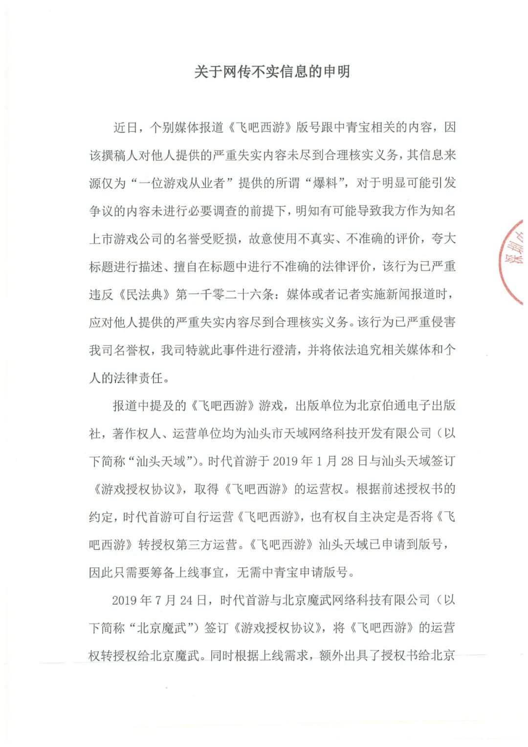 中青宝则在回应中表示,报道中提及的《飞吧西游》游戏,出版单位为北京伯通电子出版社,著作权人、运营单位均为汕头天域。