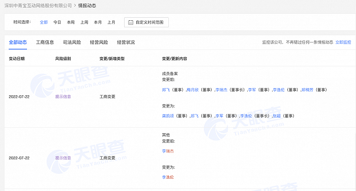 App显示,7月22日,深圳中青宝互动网络股份有限公司发生工商变更,李瑞杰退出法定代表人,由儿子李逸伦接任。