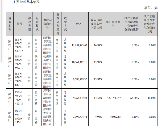 财报共公布了5款网络游戏营收情况,其中最高营收为1165万元。