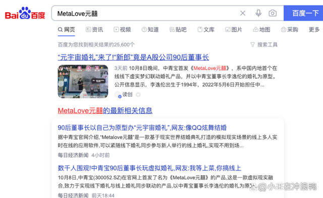 讲的是中青宝推出了一个名叫《MetaLove元囍》的APP,简单来讲就是一个虚拟世界,大概还原了这位90后董事长近期的婚礼现场。用户在下载APP后,能够以虚拟身份参与这场所谓的1:1还原的虚拟婚礼。