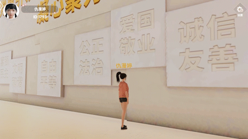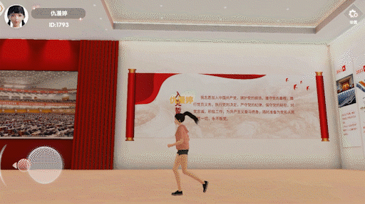 通过“捏脸”塑造出的虚拟形象成为用户在线上进行表达的重要载体,一方面,通过打招呼、语音交流、肢体交流功能,实现陌生人社交,快速建立与他人的联系,充分满足用户社交需求;另一方面,数字化虚拟党建馆中设有虚拟主播,讲解当前的热点知识、传播红色文化,通过举手提问功能,增强学习过程的沉浸感和互动性。