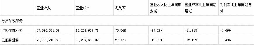 但问题在于,2023年H1期间网络游戏业务的营收虽然只有4989.6万元,同比减少了27.27%,低于云服务业务,但毛利率达到73.54%,相比之下游戏业务的盈利空间其实要更大。