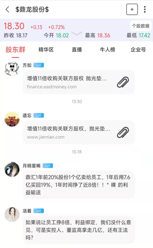 在尺度鼎龙股份股东群,投资者对鼎龙股份这波神操作议论纷纷,有投资者称,鼎汇1年前20%股份1个亿卖给员工持股平台,1年后用7.6亿买回19%,1年时间挣了近8倍!这是赤裸裸的利益输送。还有投资者称,如果说让员工挣8倍都可以,可现在是实控人、董监高拿走了几亿,还有王法吗?