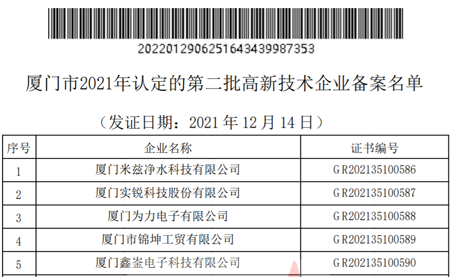 近日,厦门市2021年第二批备案的625家国家级高新技术企业获国家高企认定办正式批复,加上第一批批复的585家国家级高新技术企业,截至目前已有1210家国家级高企获得批复,厦门中创环保科技股份有限公司名列其中。