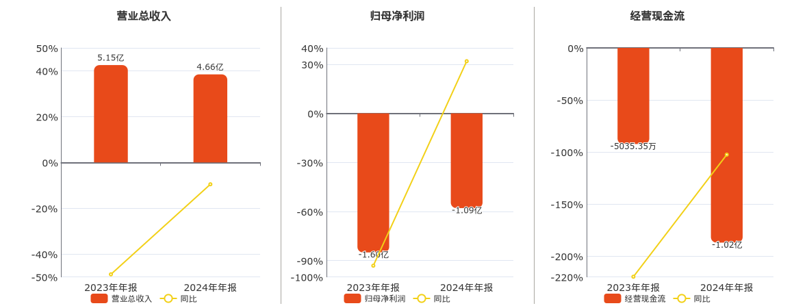 公司营业总收入为4.66亿元,较去年同报告期营业总收入减少4912.50万元,同比较去年同期下降9.54%。归母净利润为-1.09亿元。经营活动现金净流入为-1.02亿元,较去年同报告期经营活动现金净流入减少5161.83万元。
