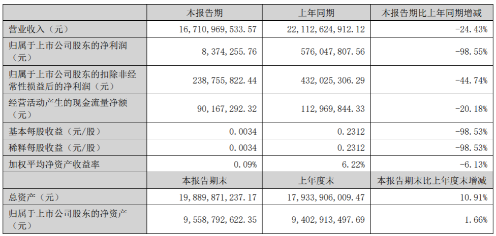 报告期内,公司实现营业收入167.11亿元,同比下降24.43%,归属于上市公司股东的净利润837.4万元,同比下降98.55%,实现归属于上市公司股东的扣除非经常性损益后的净利润2.39亿元,同比下降44.74%。