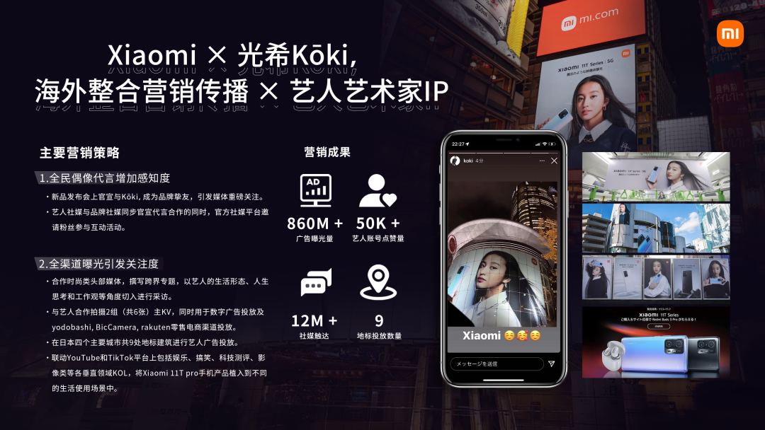 小米在日本发布旗舰新品Xiaomi 11T Series,邀请日本艺人光希Kōki,以“Xiaomi品牌挚友”的身份对产品进行代言合作,并为新品拍摄了一组形象广告大片作为主视觉之一,在新品媒体发布会上强势曝光,吸引科技媒体以及时尚娱乐等圈层媒体的强势关注。艺人大片素材同步进行数字广告、地标广告、零售店物料等投放,实现线上线下全渠道联合发力,最大化曝光效果,以艺人“年轻活力”的影响力提升小米品牌形象,增加高端机竞争市场中消费者对产品的喜爱和期待。