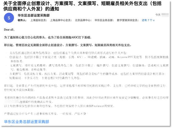 这封邮件说了,这么做是为了遏制核心能力空心化的势头,也为了给全面拥抱AIGC打下基础。言外之意是,不要外包,自家员工要和人工智能打配合了,节省支出地把活干。