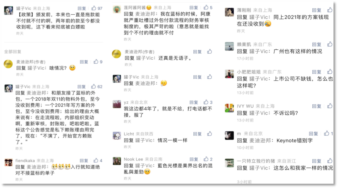 一名上海IP的网友称,2018年接了蓝色光标一个“双11”的物料外包,2021年还给写过方案,但至今都没收到费用。一催就是“在走流程、内部组织变动、重新审核、封账”等理由,“现在直接不演了,开始官方赖账了”。