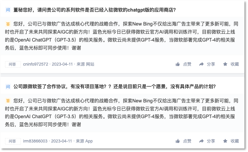 连续释放利好,蓝色光标股价在3月份大涨70.11%。到了4月,这一势头仍在延续,3天前,蓝色光标还在互动平台多次称,其已获得微软云官方AI调用和训练许可,“目前微软云上线的是OpenAI ChatGPT(GPT-3.5)的相关服务,当微软部署完成GPT-4的相关服务后,蓝色光标即可同步使用。”