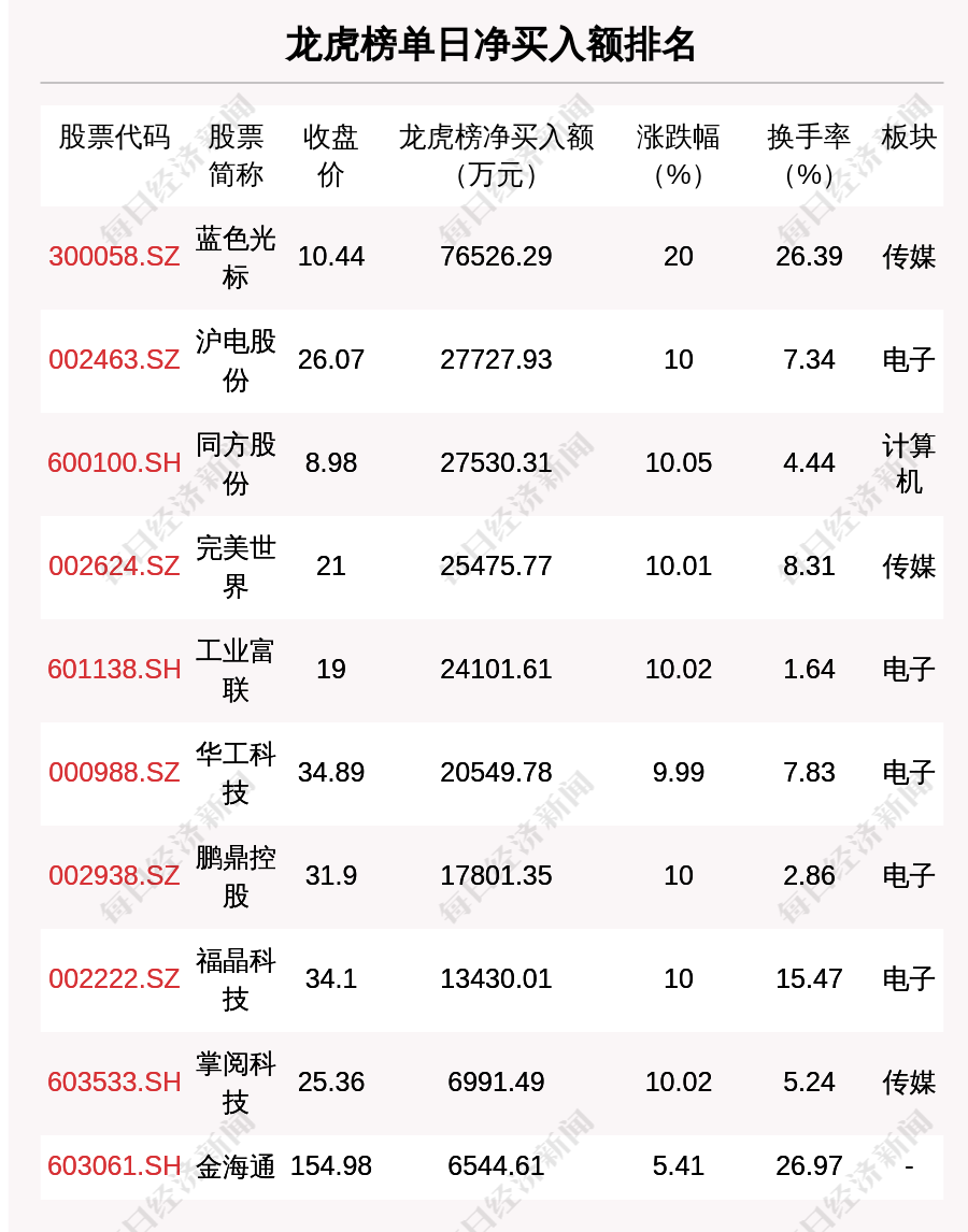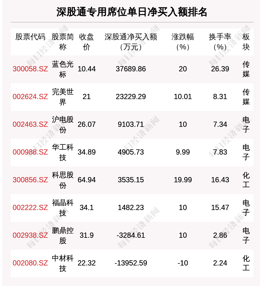 在龙虎榜中,涉及深股通专用席位的个股有8只,蓝色光标的深股通专用席位净买入额最大,净买入3.77亿元。