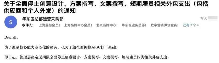 在蓝色光标内部,则开启全员“人+AI助理”的工作模式。4月12日,蓝色光标发布内部信,宣布全面停止创意设计、方案撰写、文案撰写、短期雇员四类相关外包支出,以防止能力空心化的势头以及为全面拥抱AIGC打下基础。