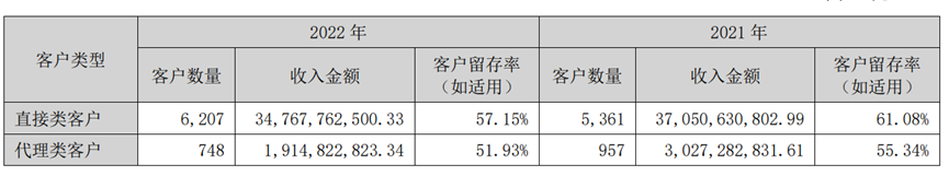 根据财报资料,2022年,蓝色光标的直接类客户数量为6207家,较上年同期的5361家有所增加,代理类客户数量则从2021年的957家下降至748家。而两种客户类型的留存率均出现下降,前者从61%降至57%,后者从55%降至52%。