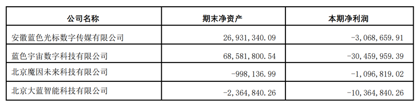 不过布局一年,元宇宙相关业务非但未能拉公司业绩一把,反而还造成了亏损。财报显示,2022年,蓝色宇宙、魔因未来和大蓝智能三家公司无一盈利,净亏损分别为3046万元、110万元和1036万元,合计亏损超过4000万元。其中,魔因未来和大蓝智能还陷入负资产。