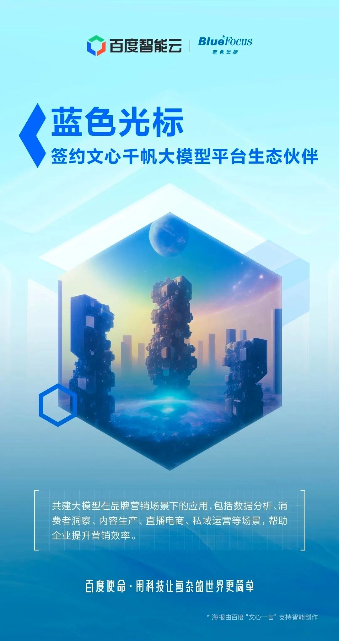 蓝色光标发布AI2战略以来,全力推进AIGC技术在营销领域的实践落地,加速探索AIGC在文字、图像、视频等内容创作中的商业模式。此次和文心千帆的合作,会进一步推动大模型在营销领域的应用和快速落地,未来蓝色光标将与百度加强生态伙伴的合作,在更多更有价值的领域持续探索,推动营销行业商业模式变革。