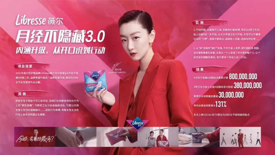 Libresse薇尔,作为全球首个提出「打破月经禁忌」的主流品牌,倡导月经正名化,先锋女性精神的号召者,在中国提出#月经不隐藏#的第三年,内涵升级,启发女性打破经期生活中从表达到行动中的惯性隐藏,为女性重塑在经期可以如何行动的想象,让#月经不隐藏#不仅仅是一句口号,更升级落实为具体行动,赋能薇尔“从0-1”建立一个女性消费新图腾。