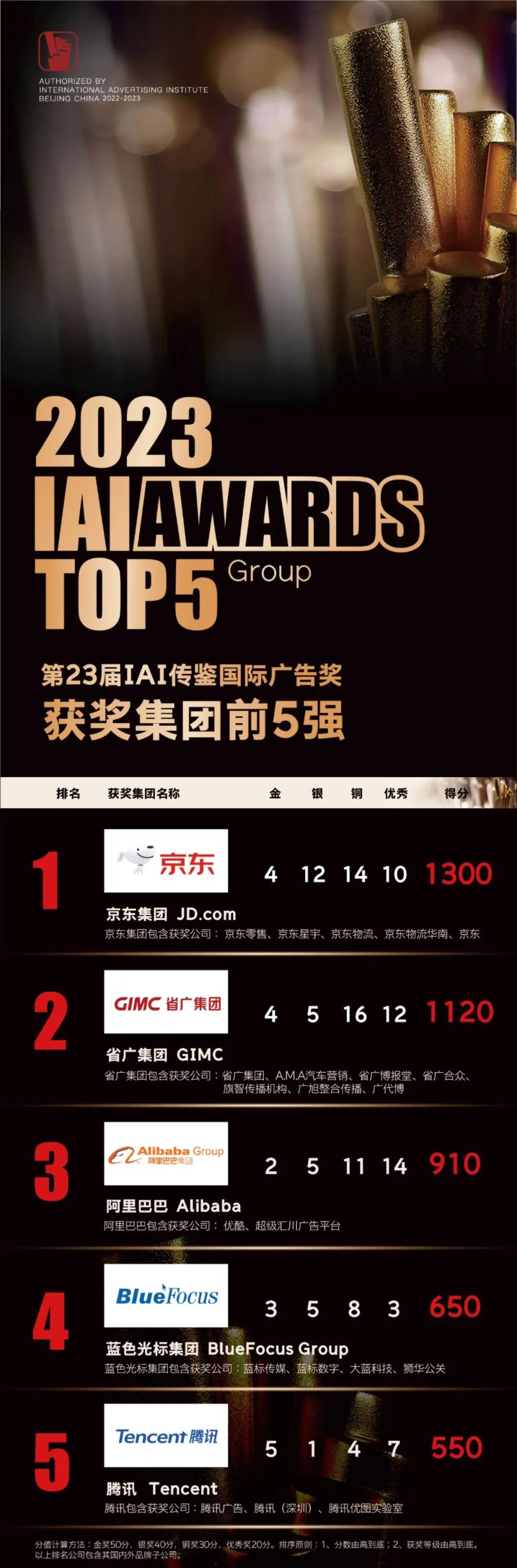 近日,第23届IAI传鉴国际广告奖颁奖典礼于北京圆满落幕,本届广告奖获奖名单也正式公布。蓝色光标旗下蓝标传媒、蓝标数字、大蓝科技、狮华公关将3金5银8铜3优秀共计19项案例奖杯收入囊中,同时蓝标传媒获颁“年度数字营销公司”大奖,共同助力蓝色光标集团荣登IAI获奖集团Top 5榜单。
