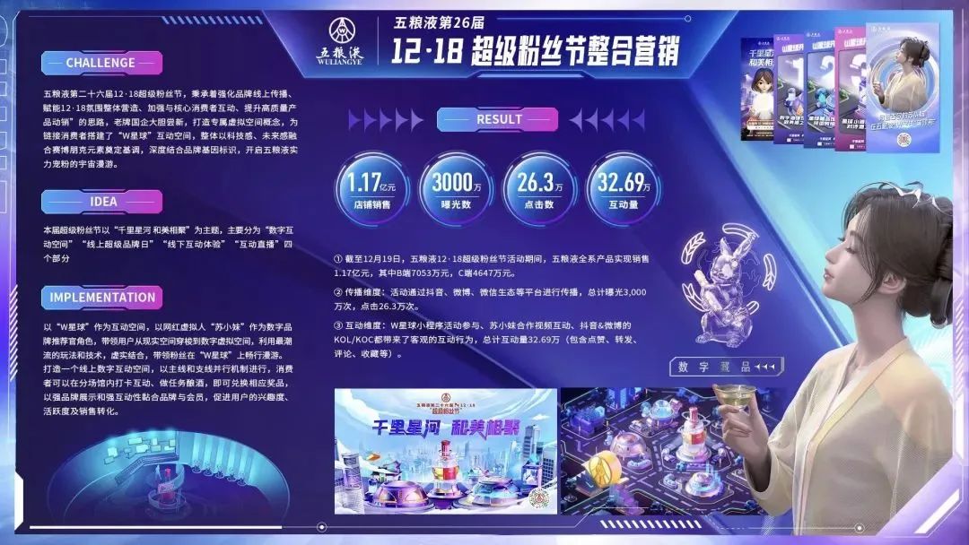 五粮液大胆尝新、实力宠粉,在12·18超级粉丝节来临之际,搭建极具科技感和未来感的“W星球”虚拟互动空间。深度结合品牌基因标识,并融入赛博朋克元素奠定基调,叠加强互动性主线和支线任务,大大提高用户的兴趣度、活跃度及销售转化。同时,特邀网红虚拟人“苏小妹”,带领用户从现实空间穿梭到数字虚拟空间,虚实结合,引入最潮流的玩法和技术,与粉丝一同开启“W星球”的宇宙漫游。