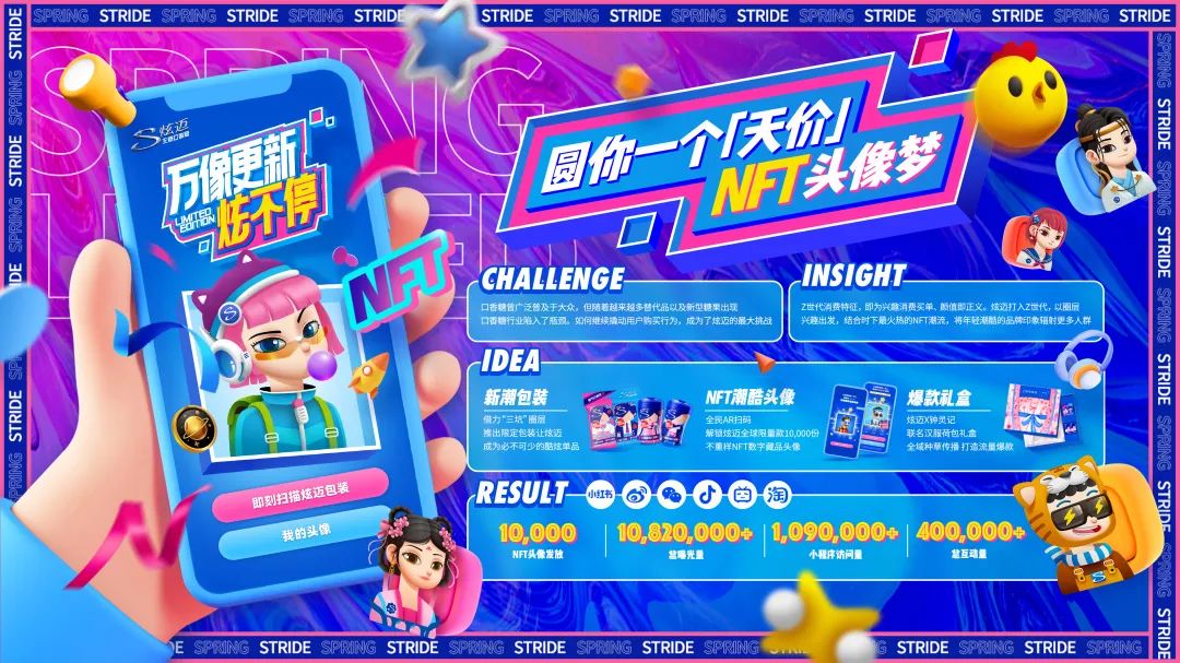 口香糖曾广泛普及于大众,但随着越来越多替代品及新型糖果出现,口香糖行业陷入瓶颈。如何继续撬动用户的购买行为,成为炫迈最大的挑战。春日是社交高峰季节,且是口香糖消耗的高峰期,“根本停不下来”的炫迈Stride,作为潮酷的口香糖品牌,为打入Z世代,以圈层兴趣出发:GEN-Z人群的消费特征,即为兴趣消费买单,颜值即正义。炫迈Stride联动腾讯至信链平台,结合时下最火热的NFT互动潮流玩法——扫描口香糖外包装/扫码,盲盒式解锁10000份NFT数字藏品头像,将“年轻潮酷”的品牌印象辐射更多人群。