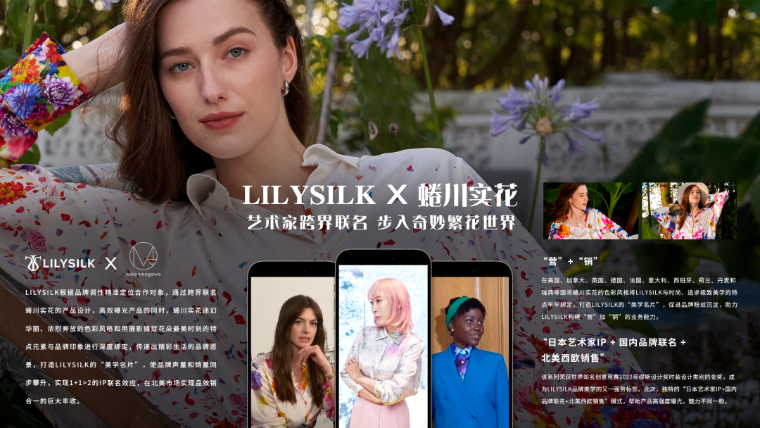 深入洞察品牌的风格特点和目标受众,帮助LILYSILK与日本知名艺术家蜷川实花(Mika Ninagawa)达成跨界联名合作。推动LILYSILK根据品牌调性精准定位合作对象,通过跨界联名的产品设计,高效曝光产品的同时,将百合、时尚、优雅等元素与品牌印象进行深度绑定,传递出精彩生活品牌愿景的同时,打造LILYSILK的“美学名片”,使品牌声量和销量同步攀升,实现1+1 2的IP联名效应,在北美市场实现品效销合一的巨大丰收。