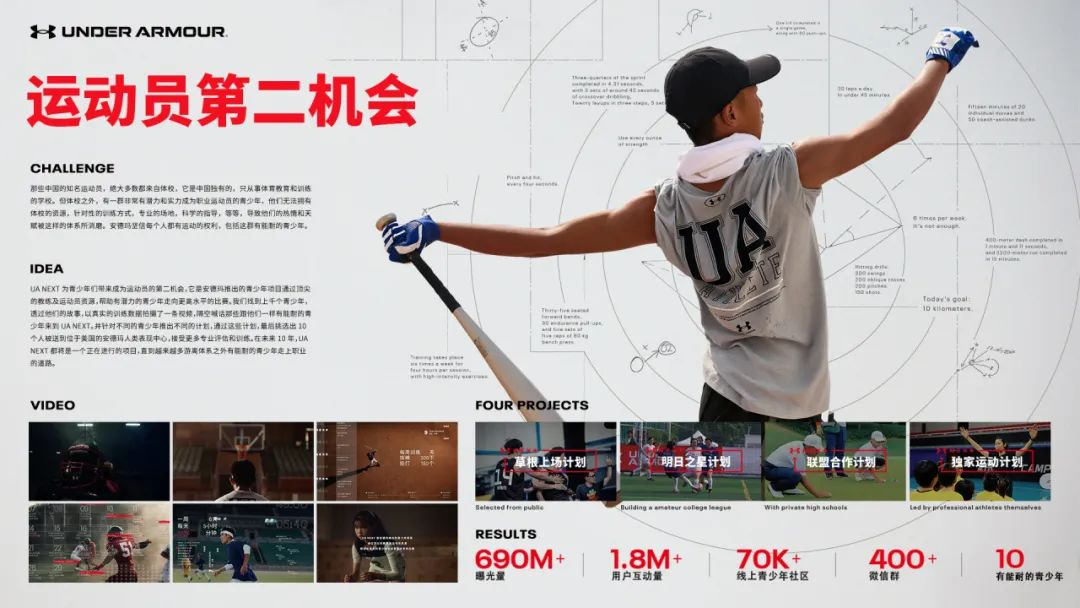 UA NEXT为青少年们带来成为运动员的第二机会,这是安德玛推出的青少年项目,通过顶尖的教练及运动员资源,帮助有潜力的青少年走向更高水平的比赛。我们找到上千个青少年,透过他们的故事,以真实的训练数据拍摄了一条视频,隔空喊话那些跟他们一样有能耐的青少年来到UA NEXT,并针对不同的青少年推出不同的计划,通过这些计划,最后挑选出10个人并被送到位于美国的安德玛人类表现中心,接受更多专业评估和训练。在未来10年,UA NEXT项目都将持续进行,直到越来越多游离体系之外,有能耐的青少年走上职业道路。