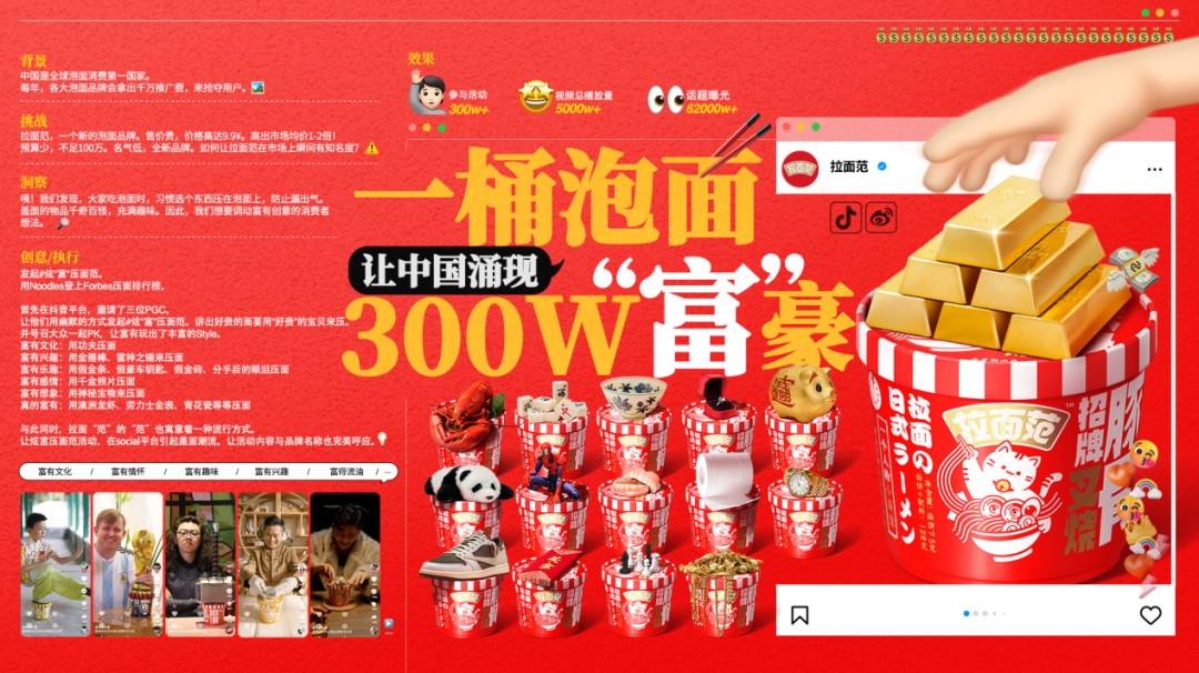 今麦郎进军高端速食品线,推出高端贵价新品——拉面范,并希望凸显产品“好”“贵”的品质。如何通过社交互动实现用户沟通,引发强烈热度?我们给出了一个玩梗和自嘲的方式,激发了网友的“反骨”——吃碗拉面范,我膨胀了!用自己觉得“贵”的东西来边炫富,边吃面,从而引发炫耀式的病毒扩散。这一场花式“泡面炫富”也通过明星直播,话题挑战快速出圈,将定位“贵”,变成炫富活动,富有文化、富有兴趣、富有感情,富有想象……用颠覆性的社会化营销手段,解决了客户想说而不敢说的议题。