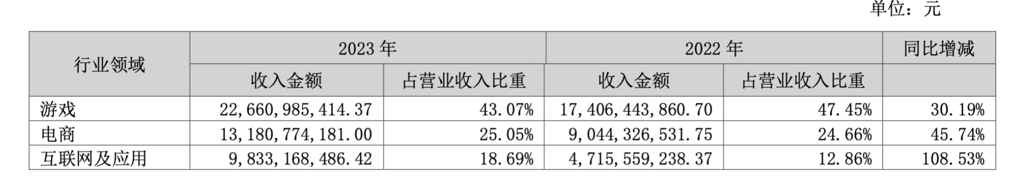 据财报数据显示,去年,随着公司AI战略的全面提升,公司在游戏、电子商务等行业客户收入保持稳中有升。具体来看,在游戏领域,营收同比增长三成,营收占比超四成;其次为电商领域,营收同比增长45.74%,营收占比进一步提升至25.05%;互联网及应用收入同比翻番,收入占比进一步提升至近两成。