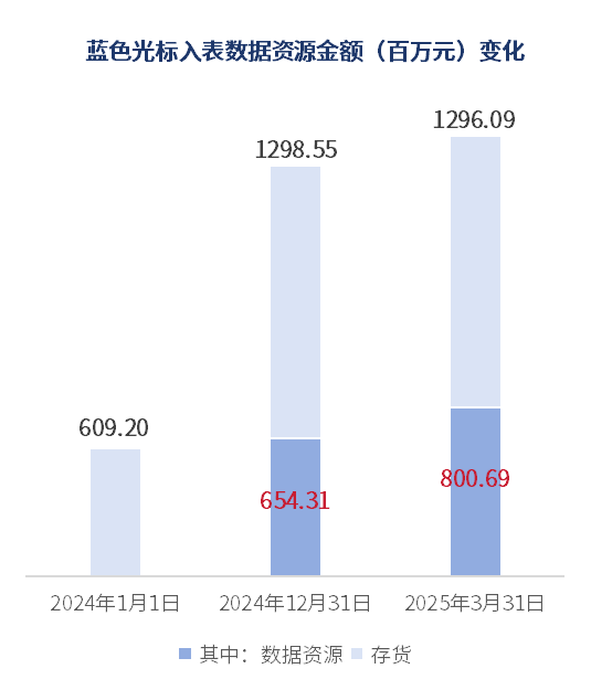 数字营销行业首家入表数据资源的上市公司蓝色光标(300058.SZ),于4月25日公布的2024年年度报告中披露数据资源654.31万元,并少见地全部计入了存货科目,占到所有存货资产的50%以上。在同日公布的2025年一季报中,蓝色光标的存货数据资源增加至800.69万元,在所有存货资产总额未有明显变化的情况下,数据资源占比增加至61.78%。与223.71亿元的资产总规模相比,占比并不多。