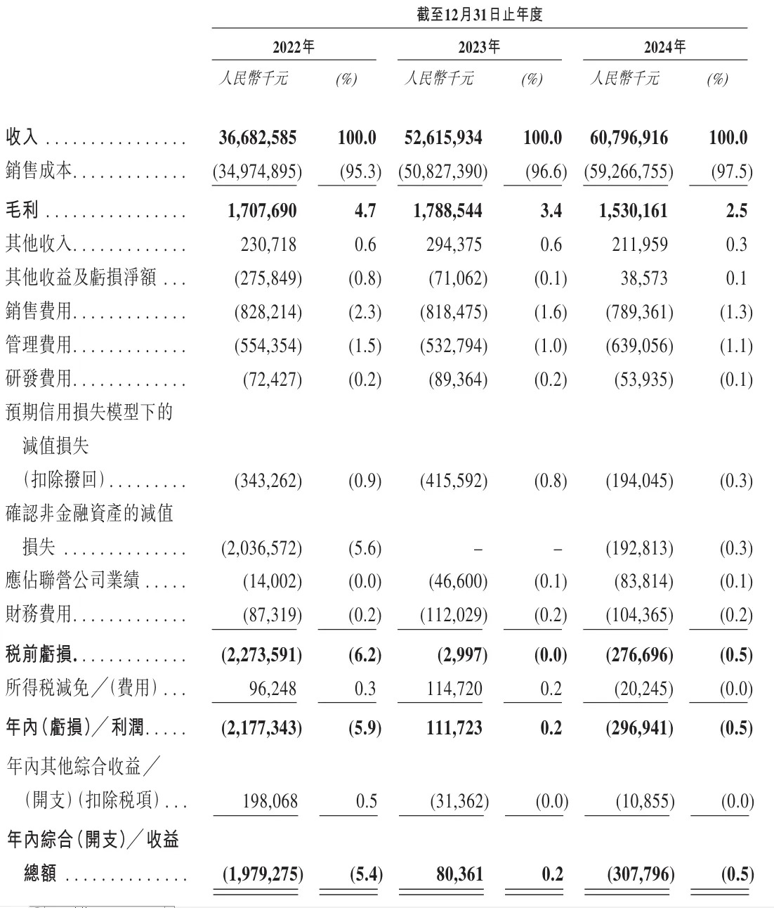 招股书显示,蓝标2022年、2023年、2024年营收分别为366.83亿元、526.16亿元、608亿元;毛利分别为17亿元、17.89亿元、15.3亿元;毛利率分别为4.7%、3.4%、2.5%。