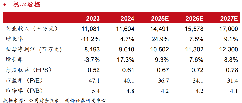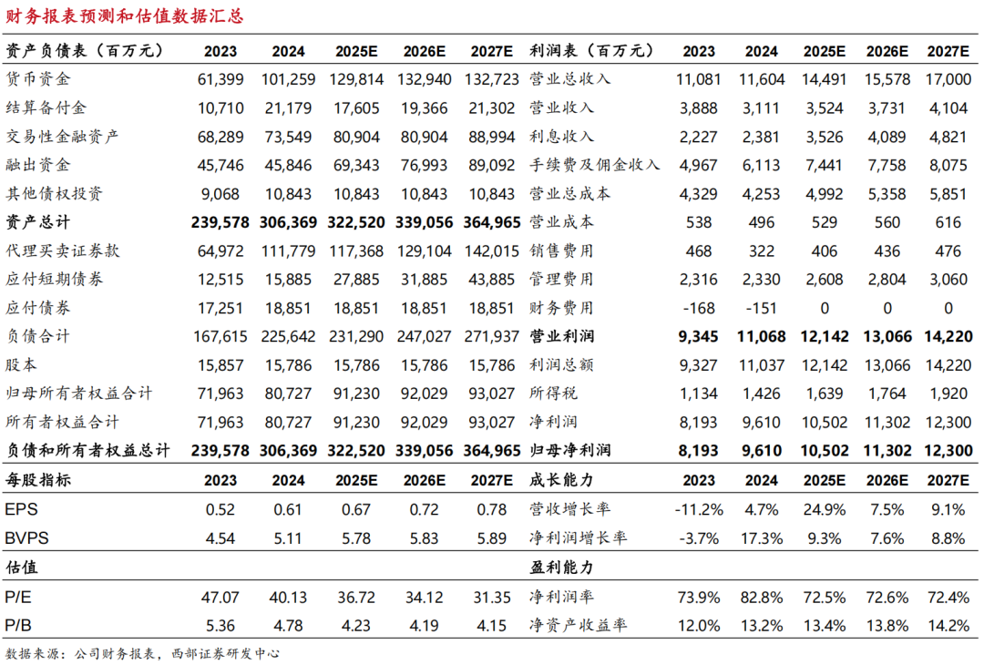 证券业务方面,公司显著受益于市场交投活跃,经纪两融市占率仍继续提升,看好市场成交维持高位下公司的经纪两融收入表现;代销业务方面,公募基金降费和产品被动化致使代销收入有所承压,但公司独特的渠道竞争优势仍在,看好财富管理市场扩容下的长期增长空间。预计公司2025-2026年归母净利润分别为105.02、113.02亿元,同比分别+9.3%、+7.6%,对应3月14日收盘价的PE估值分别为36.7、34.1倍,维持“买入”评级。