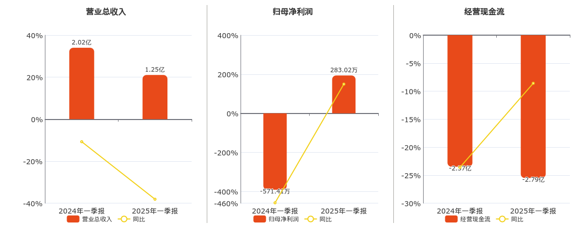 公司营业总收入为1.25亿元。归母净利润为283.02万元,较去年同报告期归母净利润增加854.43万元。经营活动现金净流入为-2.79亿元。
