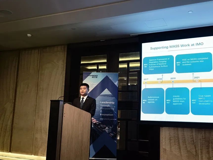 中国船级社(CCS)迪拜分社检验部经理卢炜先生也在现场为大家系统介绍了CCS在智能船舶领域的全球实践:主导制定《智能船舶规范》4.0版及MASS国际规则,赋能200余艘i-Ship认证船舶,并联合专业合作伙伴共建测试验证体系,携手开拓中东智能航运新蓝海。