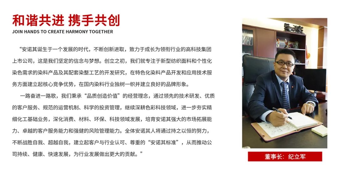 安诺其集团创立于1999年,定位中高端差异化染料市场,起步于精细化工产业,2010年4月在深交所创业板上市(股票简称:安诺其,股票代码:300067),2014年10月开启集团化发展。