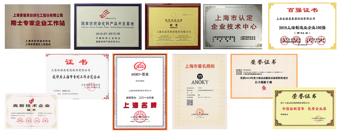 集团现已申请国家发明专利265件,拥有自主核心技术80多项,承担国家、省、市级科技项目超过20项。其中国家级科技进步奖4项,上海市科技进步奖1项,上海高新技术成果转化项目40多项。作为亚洲染料工业联合会标准主要制标单位,安诺其集团参与了《分散染料色光和强度的测定高温高压染色法》和《活性染料色光和强度的测定方法》两项行业标准制定。先后获得“国家纺织染化料产品开发基地”、“中国染料百年优秀企业”、“中国最具成长性上市公司”、“高新技术企业”、“上海市优秀专利工作示范企业”、“上海市创新型企业”、“上海市科技进步奖”、“上海民营制造企业100强”、“上海名牌”、“上海市民营企业总部”、“上海新兴企业100强”等各级资质认定以及荣誉表彰。