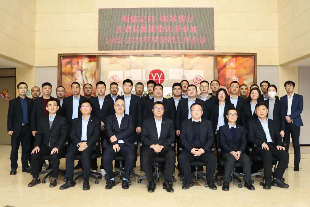 近日,安诺其集团染化事业部召开2022年度营销工作会议。董事长纪立军、总裁助理郑强、营销中心总监路增刚及全体人员、技术中心总监吴冬及工程师团队、运营中心总监杨好伟及相关人员参加本次会议。