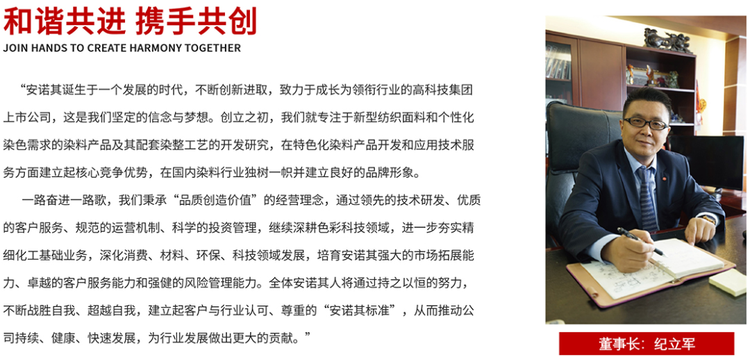 上海安诺其集团股份有限公司创立于1999年,定位中高端差异化染料市场,起步于精细化工产业,2010年4月在深交所创业板上市(股票简称:安诺其,股票代码:300067),2014年10月开启集团化发展。