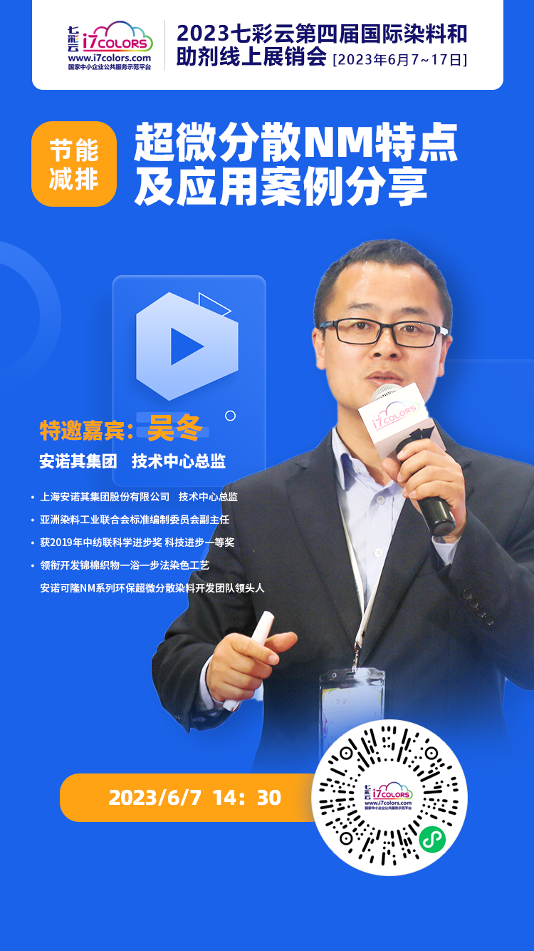 在直播间,安诺其集团技术总监吴冬将为大家带来《超微分散NM特点及应用案例分享》的专题讲解,将从节能减排方向与大家分享超微分散NM染料特点及应用,并设置特别问答环节,与大家一起交流行业新产品、新技术。