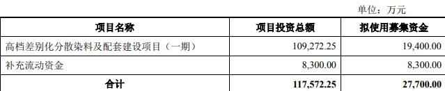 根据本次发行竞价结果,本次发行拟募集资金总额为276,999,997.16元,不超过人民币三亿元且不超过最近一年末净资产百分之二十;在扣除相关发行费用后的募集资金净额将全部用于高档差别化分散染料及配套建设项目(一期)、补充流动资金。