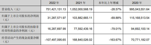 据安诺其2022年年报,报告期内,公司实现营业收入7.51亿元,同比减少28.57%;归属于上市公司股东的净利润3128.76万元,同比减少69.88%;归属于上市公司股东的扣除非经常性损益的净利润1628.77万元,同比减少79.01%;经营活动产生的现金流量净额-1.07亿元,同比减少163.67%。