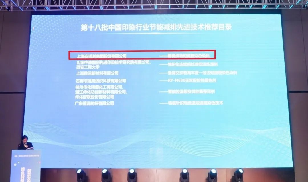 会上为《第十八批中国印染行业节能减排先进技术推荐目录》企业颁发证书,安诺其锦棉织物短流程染色染料历经严苛的遴选之后,入选推荐目录。